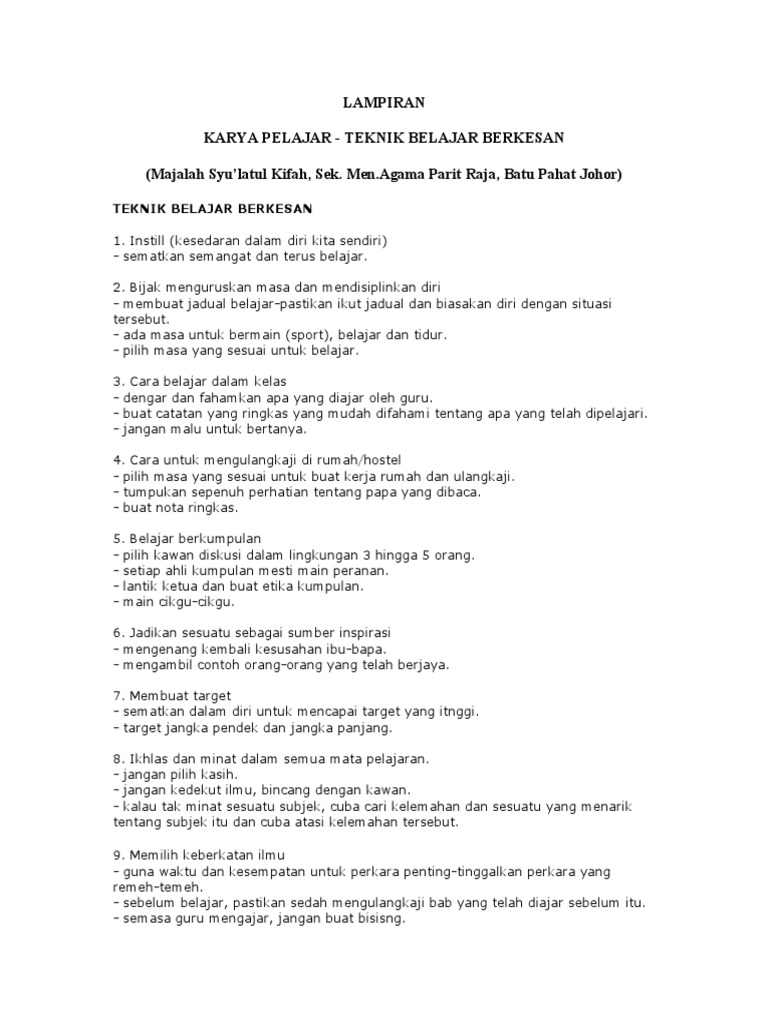 Lampiran Karya Pelajar Teknik Belajar Berkesan Majalah Syu Latul Kifah Sek Men Agama Parit Raja Batu Pahat Johor